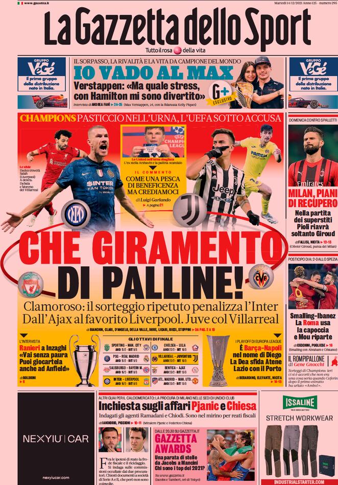 “Che giramento di palline!” titola in prima pagina l’edizione odierna de La Gazzetta dello Sport. Champions, pasticcio nell’urna, l’Uefa sotto accusa - si legge - Clamoroso, il sorteggio ripetuto penalizza l’Inter: dall’Ajax al favorito Liverpool. Juve col Villarreal. "E' Barça -Napoli nel segno di Diego" si legge quando si parla di azzurri.