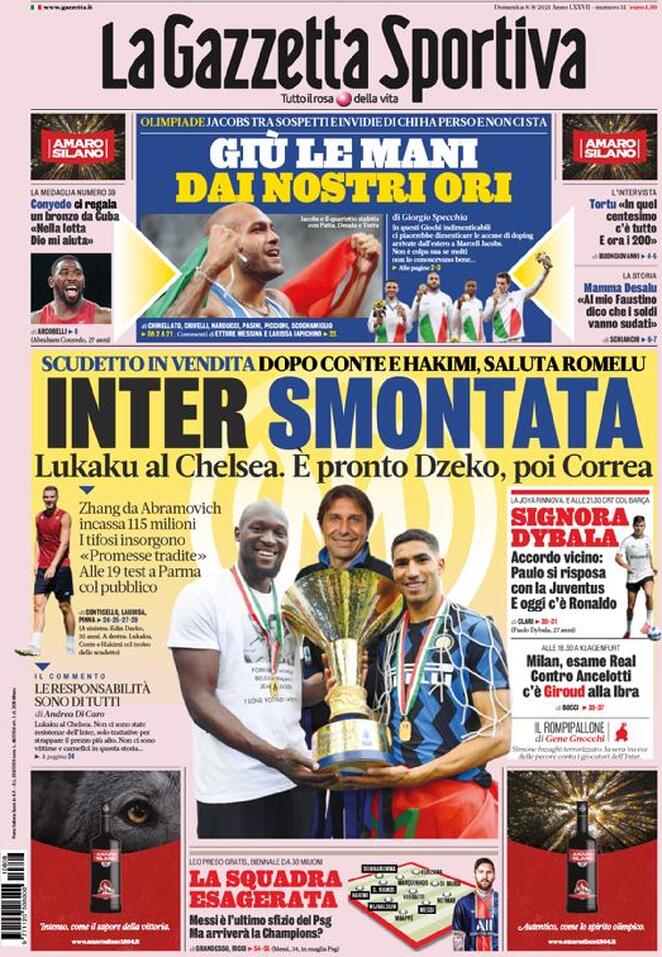 Dopo Antonio Conte e Hakimi Achraf, anche Romelu Lukaku saluta l'Inter e vola in Inghilterra, al Chelsea. E' una "Inter smontata", come titola in prima pagina La Gazzetta dello Sport oggi in edicola, che conferma l'imminente addio del centravanti belga. Per sostituirlo il club nerazzurro è pronto a prendere Edin Dzeko, prima di dare l'assalto a Joaquin Correa.