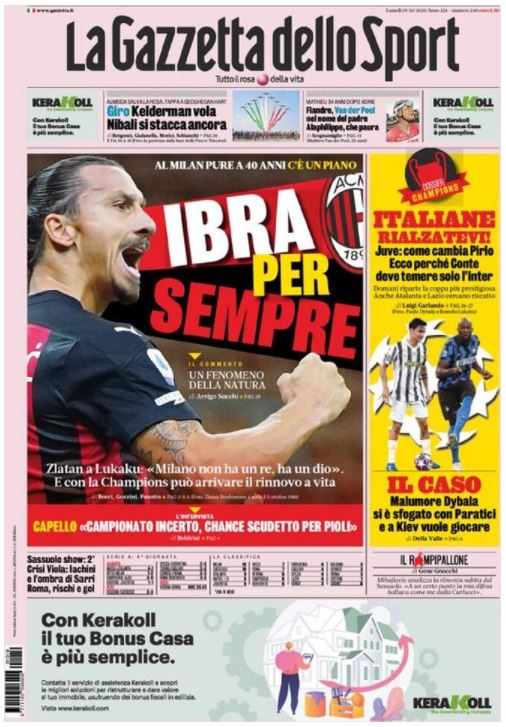 "Ibra per sempre", titola stamane La Gazzetta dello Sport in apertura di prima pagina. C'è un piano per far restare l'attaccante svedese in rossonero anche a 40 anni. E nel frattempo Ibrahimovic risponde sui social a Romelu Lukaku: "Milano non ha un re, ha un Dio". Obiettivo Champions League per il Milan: se arrivasse ecco pronto il rinnovo a vita per Zlatan Ibrahimovic.
