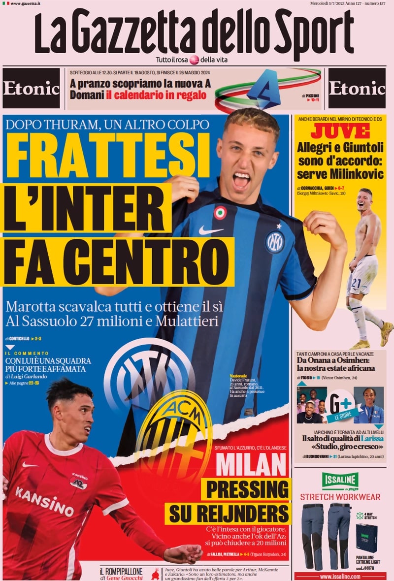 "Frattesi, l'Inter fa centro". Questa l'apertura della Gazzetta dello Sport oggi in edicola, che dedica ampio spazio al colpo dei nerazzurri, che ieri hanno chiuso per l'acquisto di Davide Frattesi dal Sassuolo. "Marotta scavalca tutti e ottiene il sì. Al Sassuolo Mulattieri e 27 milioni", prosegue il quotidiano a centro pagina.