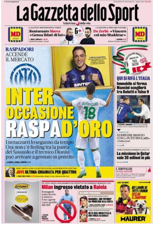 "Inter, occasione Raspad'oro". Questo il titolo di apertura in prima pagina de La Gazzetta dello Sport nell'edizione odierna. I nerazzurri lo seguono da tempo ed ora non c'è feeling tra la punta del Sassuolo e il tecnico Dionisi: può arrivare a gennaio in prestito.