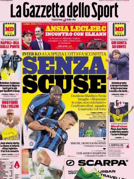 "Senza scuse", titola la Gazzetta dello Soort per l'ottavo ko dell'Inter contro lo Spezia. "I bonus sono finiti", si legge in un editoriale critico verso Inzaghi e "Così addio Champions", è l'allarme in un altro fondo di Vocalelli. Di spalla Napoli-Dea sulle punte sul confronto Osimhen-Lookman. ma anche Conte pronto a tornare in Italia ed il Milan che pensa a Joao Pedro.