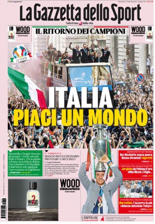 "Italia piaci un mondo". Questo il titolo di apertura in prima pagina de La Gazzetta dello Sport nell'edizione odierna. Il ritorno dei campioni con Mattarella e Draghi che ricevono gli azzurri: "Avete reso unito il Paese". Poi la parata a Roma tra la folla in delirio. Ora l'obiettivo è il Mondiale. E dall'estero solo applausi. Abbiamo invertito una tendenza andando sul dischetto senza paura: siamo diventati rigoristi. Jorginho è da Pallone d'Oro e sfida Messi. Mentre Gigio... Intanto, caso razzismo in Inghilterra.