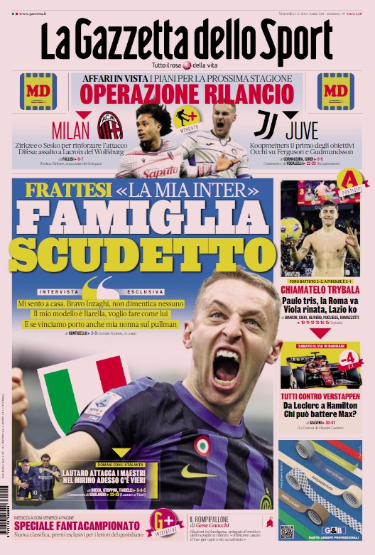 “La mia Inter. Famiglia scudetto”. Parole di Davide Frattesi, concesse nell’intervista rilasciata in esclusiva dal centrocampista nerazzurro a La Gazzetta dello Sport e con cui la Rosea apre la sua prima pagina odierna. “Mi sento a casa. Bravo Inzaghi, non dimentica nessuno. Il mio modello è Barella, voglio fare come lui. E se vinciamo porto anche mia nonna sul pullman”, le parole dell’ex Sassuolo riportate in apertura.