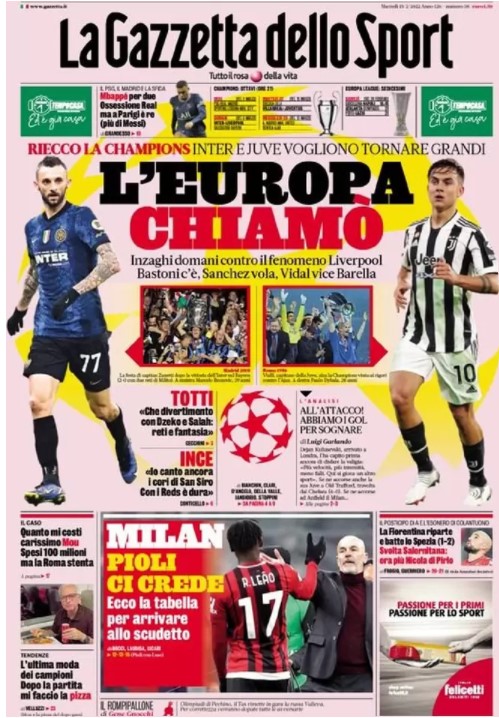 "L'Europa chiamò". Questo il titolo di apertura in prima pagina de La Gazzetta dello Sport nell'edizione odierna. Riecco la Champions League, Inter e Juventus vogliono tornare grandi. Inzaghi domani contro il fenomeno Liverpool: Bastoni c'è, Sanchez vola, Vidal vice Barella. Intanto Francesco Totti non si dimentica dei suoi ex compagni: "Che divertimento con Dzeko e Salah: reti e fantasia". E Paul Ince non scorda i nerazzurri: "Io canto ancora i cori di San Siro. Con i Reds è dura".