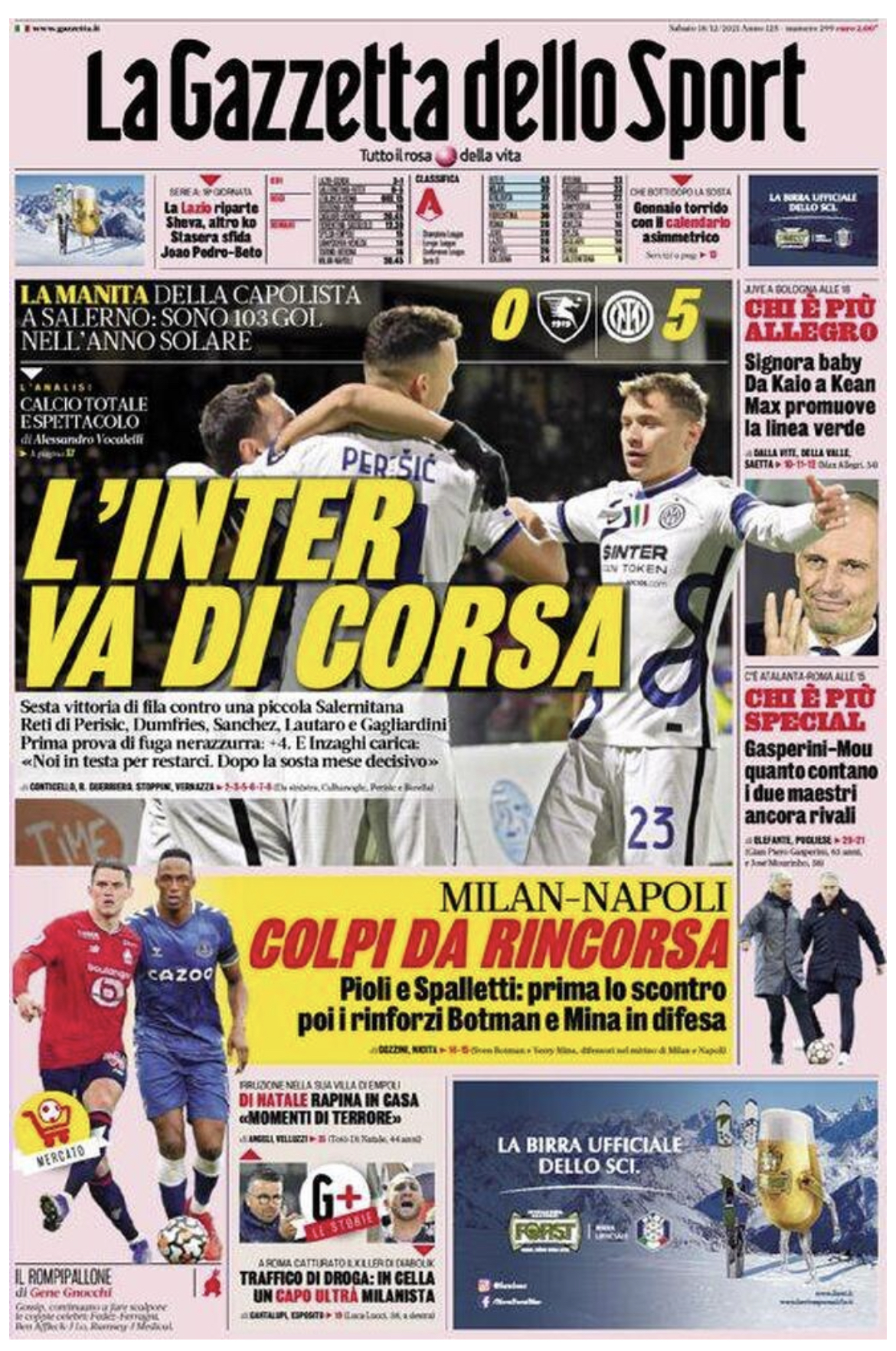 "L'Inter va di corsa" è il titolo con cui si apre l'odierna edizione de La Gazzetta dello Sport questa mattina in edicola sulla vittoria dei nerazzurri di ieri sera. L'Inter cala la manita a Salerno: sono 103 le reti nell'anno solare per la squadra di Simone Inzaghi. Sesta vittoria di fila contro una piccola Salernitana: reti di Perisic, Dumfries, Sanchez, Lautaro e Gagliardini. Prima prova di fuga nerazzurra: +4 dalla seconda e Inzaghi carica: "Noi in testa per restarci: dopo la sosta mese decisivo".