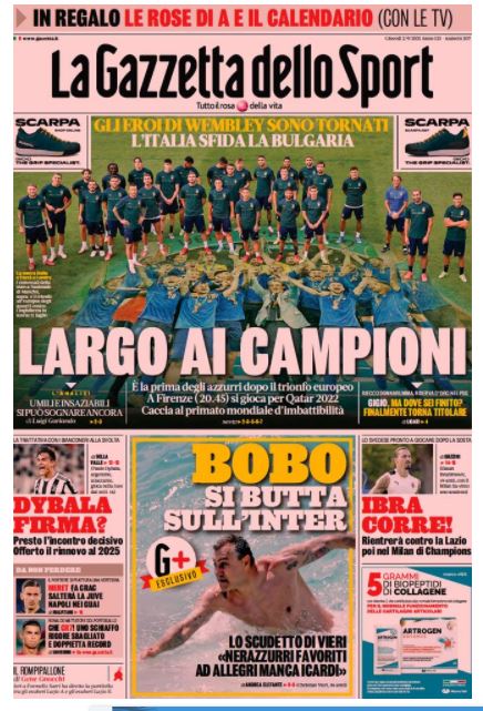L'edizione odierna de La Gazzetta dello Sport apre in prima pagina con il titolo: "Largo ai campioni". Torna in campo stasera la nazionale azzurra, campione d'Europa meno di due mesi fa. A Firenze, con calcio d'inizio alle 20.45, si gioca per le qualificazioni a Qatar 2022 contro la Bulgaria. Caccia ai tre punti e al primato mondiale di imbattibilità.