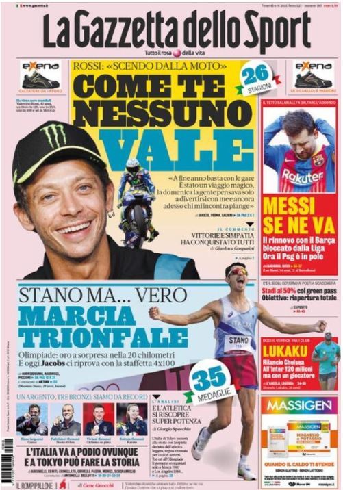 "Lukaku, rilancio Chelsea. All'Inter 120 milioni, ma con un giocatore". Questo il titolo che La Gazzetta dello Sport propone nel taglio laterale della prima pagina nell'edizione odierna. In apertura spazio all'addio alla Moto GP di Valentino Rossi e all'oro di Massimo Stano nella 25 km di marcia. Per quanto riguarda i nerazzurri, prosegue la trattativa per la cessione del belga con i due club che hanno fissato il vertice per oggi.