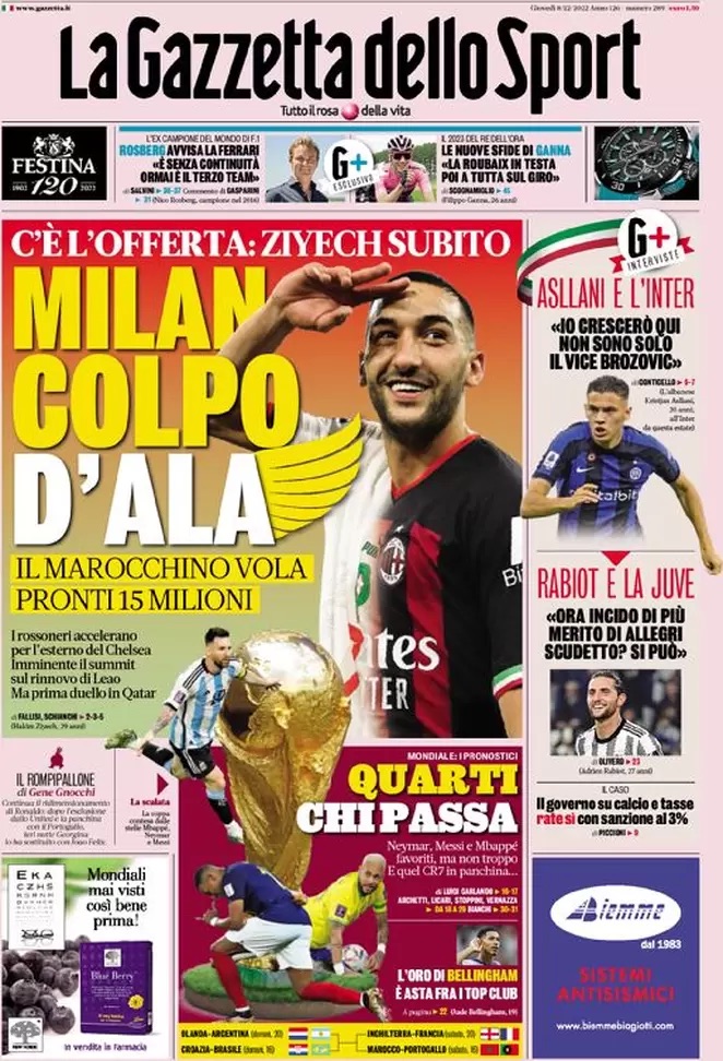 “Milan, colpo d’ala” titola in prima pagina l’edizione odierna de La Gazzetta dello Sport. C’è l’offerta: Ziyech subito - si legge - Il marocchino vola, pronti 15 milioni. I rossoneri accelerano per l’esterno del Chelsea. Imminente il summit sul rinnovo di Leao, ma prima duello in Qatar.