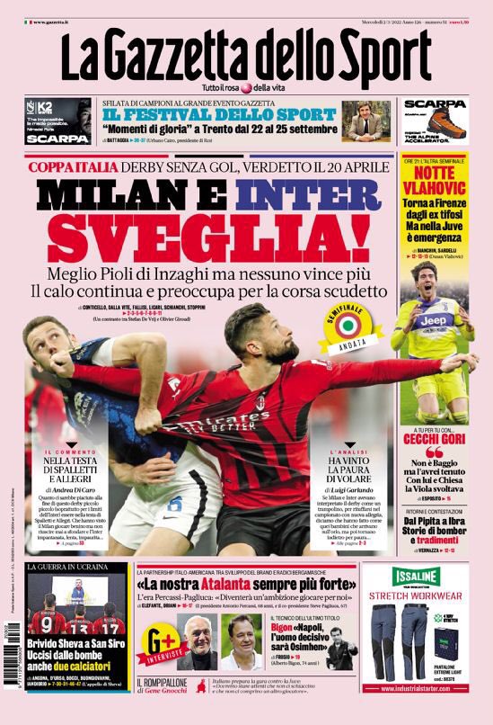 La Gazzetta dello Sport, nell'edizione di oggi, apre in prima pagina con il pareggio nel derby della Madonnina in Coppa Italia: "Milan e Inter sveglia! Meglio Pioli di Inzaghi ma nessuno vince più. Il calo continua e preoccupa per la corsa scudetto". Di spalla spazio al ritorno dell'ex Vlahovic al Franchi per la semifinale di Coppa Italia tra Fiorentina e Juventus: "Notte Vlahovic". In taglio basso spazio all'intervista dell'ex tecnico azzurro Albertino Bigon: "Napoli, l'uomo decisivo sarà Osimhen".