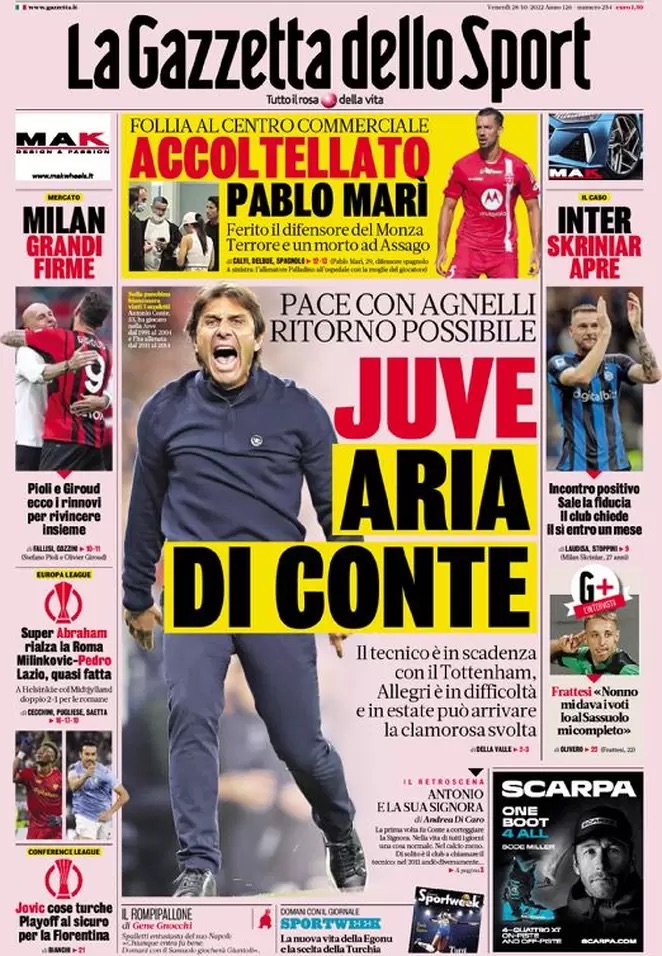 “Aria di Conte” titola in prima pagina l’edizione odierna de La Gazzetta dello Sport. Pace con Angelli, ritorno possibile - si legge - Il tecnico è in scadenza con il Tottenham, Allegri è in difficoltà e in estate può arrivare la clamorosa svolta.