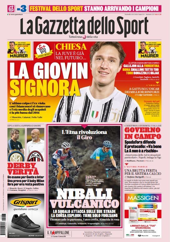 "La giovin Signora", titola La Gazzetta dello Sport in apertura di prima pagina. L'ultimo colpo del mercato chiusosi ieri sera alle 20 è l'ormai ex viola Federico Chiesa: l'età media degli acquisti della Juventus è la più bassa dal 2016. Una Juventus che guarda al futuro. Chiesa lascia la Fiorentina dopo 12 anni in viola: alla Fiorentina al suo posto è andato Josè Maria Callejon. La Roma ha chiuso Smalling sul filo di lana, con l'approvazione arrivata oltre due ore dopo la chiusura delle trattative.