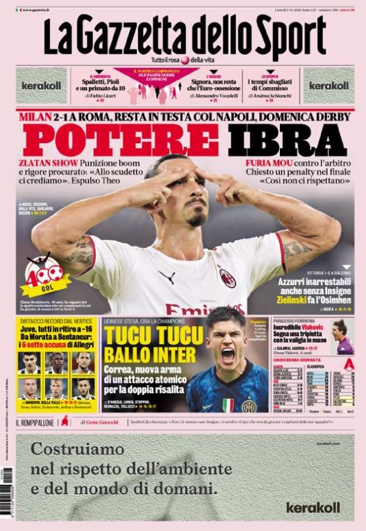 "Potere Ibra". Questo il titolo di apertura in prima pagina de La Gazzetta dello Sport nell'edizione odierna. Il Milan vince 2-1 a Roma, resta in testa con il Napoli e si prepara al derby di domenica. Zlatan show, punizione boom e rigore procurato: "Allo scudetto ci crediamo". Espulso Theo. Furia Mou contro l'arbitro. Chiesto un penalty nel finale: "Così non ci rispettano". Anche il Napoli è inarrestabile: senza Insigne, Zielinski fa l'Osimhen.