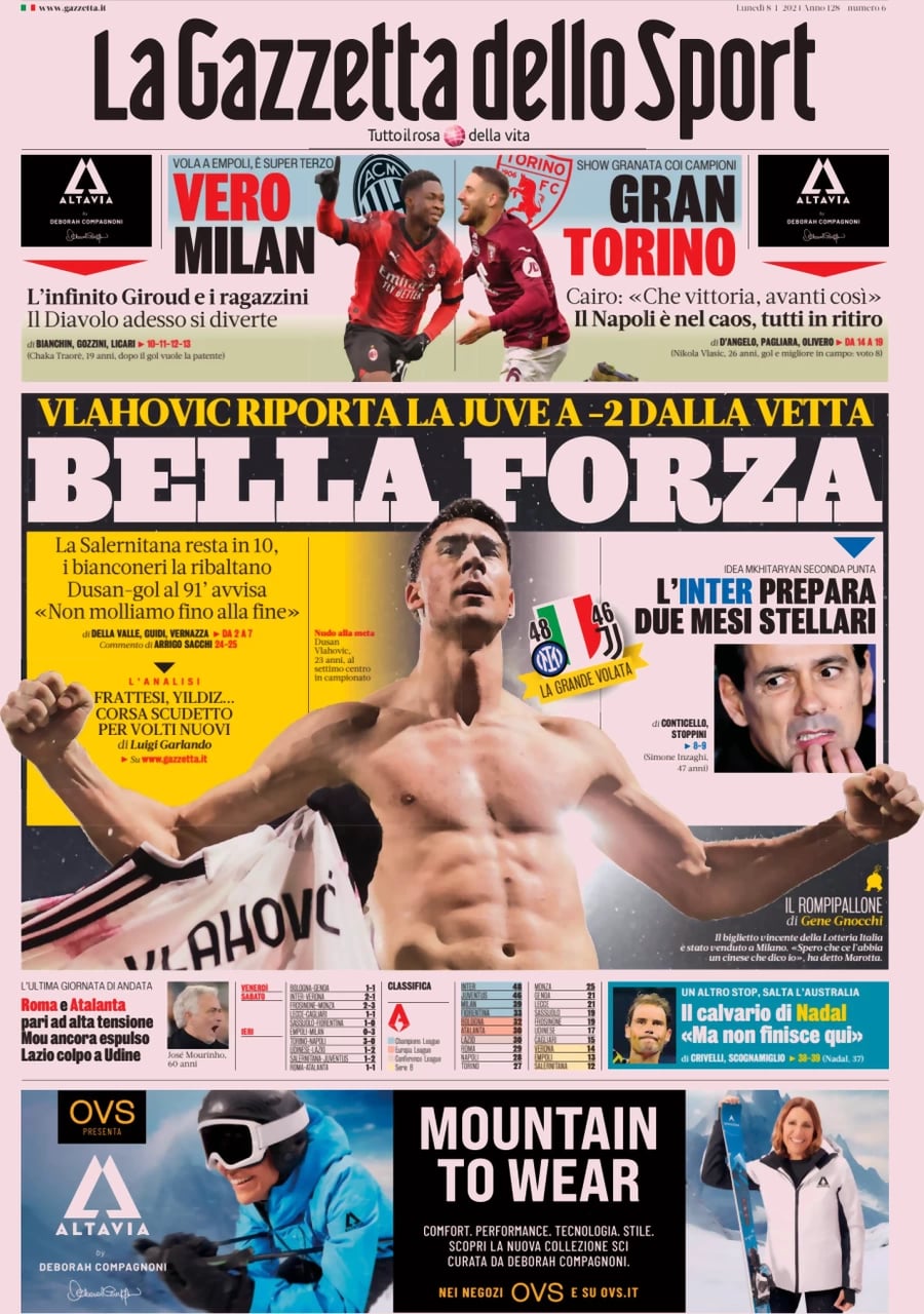 "Bella forza" scrive La Gazzetta dello Sport in apertura sulla vittoria della Juventus per 1-2 in casa della Salernitana. I campani restano in 10 dopo essere passati in vantaggio e la squadra di Allegri vince in rimonta con le reti di Iling Junior e di Vlahovic: bianconeri nuovamente a -2 dall'Inter capolista. Dusan-gol al 91' avvisa: "Non molliamo".