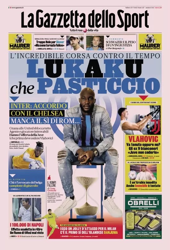"I 100.000 di Napoli", titola così in prima pagina la Gazzetta dello Sport nell'edizione di oggi. "Effetto scudetto in ritiro. Un fiume di tifosi mai visto". In apertura il caso Lukaku: "Lukaku che pasticcio" perché manca il suo sì all'Inter. Ancora spazio al mercato di spalla: "E' un'Arabia inaudita. Anche Immobile è tentato".