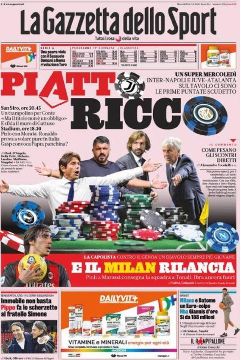 "Piatto ricco". Questo il titolo di apertura in prima de La Gazzetta dello Sport sulle sfide di oggi in Serie A. Un super mercoledì con Inter-Napoli e Juventus-Atalanta: sul tavolo ci sono le prime puntate scudetto. A San Siro alle 20:45 c'è un trampolino per Conte: "Ma il titolo non è un obbligo". E sfida il muro di Gattuso. Allo Stadium alle 18:30 Pirlo con Morata-Ronaldo prova a volare pure in Italia. Gasp convoca Papu: panchina?