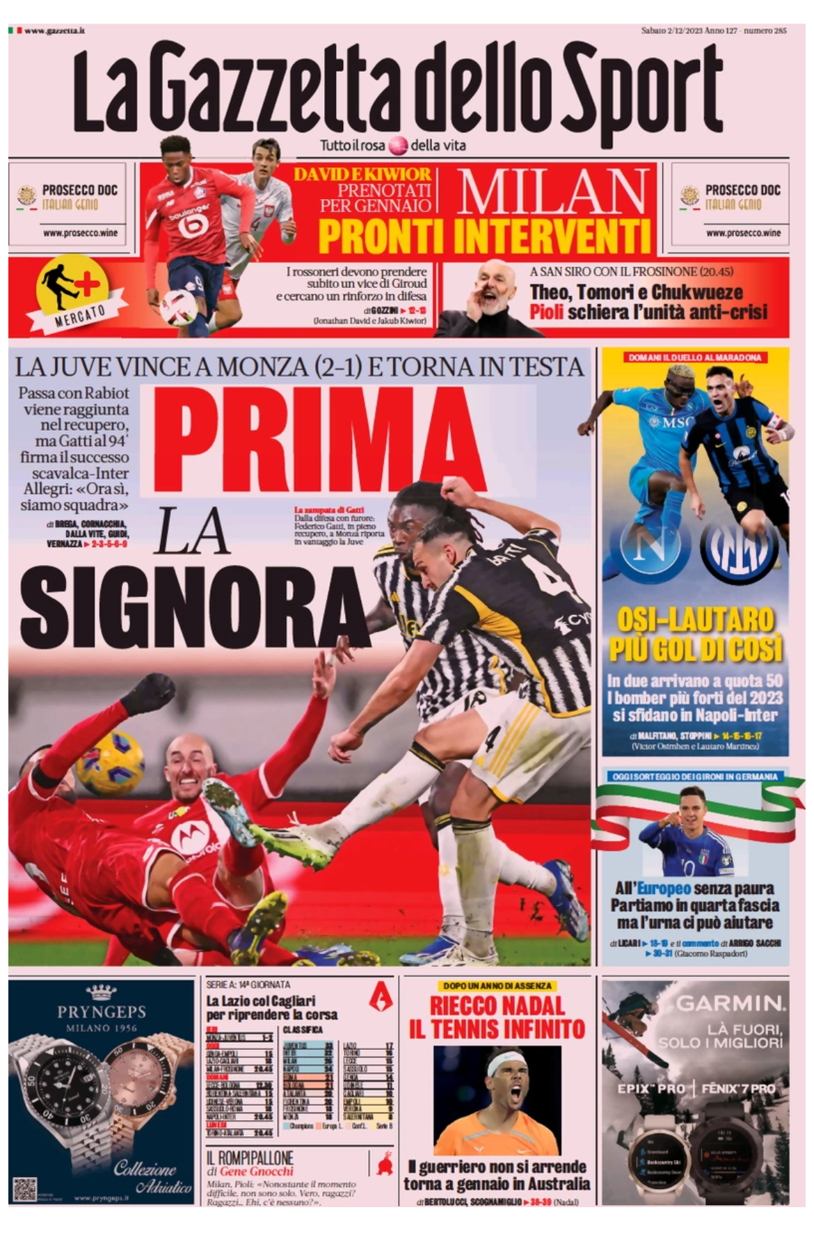 "Prima la Signora" è il titolo con cui si apre l'odierna edizione de La Gazzetta dello Sport in merito alla vittoria della Juventus che ieri sera ha vinto a Monza per 2-1 tornando così in testa al campionato. Passa con Rabiot, viene raggiunta nel recupero, ma Gatti al 94' firma il successo. Scavalca così l'Inter in classica. "Osi-Lautaro, più gol di così..." il titolo di spalla che anticipa la sfida di domani tra Napoli e Inter.
