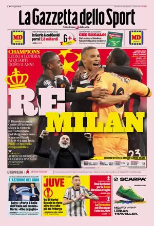 "Re Milan". Così titola l'edizione odierna de La Gazzetta dello Sport, per celebrare il ritorno dei rossoneri nei quarti di finale di Champions League dopo 11 anni. Dopo il successo per 1-0 a San Siro contro il Tottenham, alla squadra di Pioli è bastato pareggiare 0-0 a Londra per passare il turno.