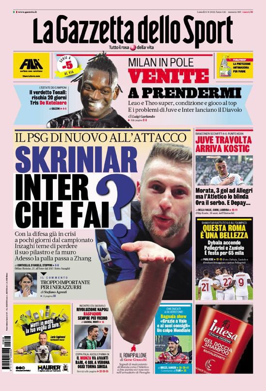 "Rivoluzione Napoli, Raspadori sempre più vicino", il mercato azzurro in prima pagina nell'edizione di oggi della Gazzetta dello Sport. Apertura ancora con il mercato in evidenza: "Skriniar: Inter che fai? Il Psg di nuovo all'attacco". Di spalla spazio alle amichevoli di Juventus e Roma: "Juve travolta, arriva Kostic". "Questa Roma è una bellezza".