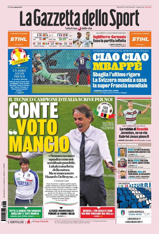 "Rocchi al posto di Rizzoli: designatore arbitri e VAR". Questo il titolo di apertura in prima pagina de La Gazzetta dello Sport nell'edizione odierna. Si parla anche di Antonio Conte che incorona l'Italia di Mancini. In taglio alto l'eliminazione della Francia da Euro2020: "Ciao Ciao Mbappè".