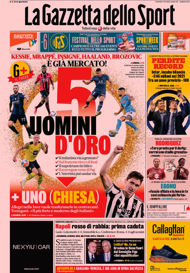 "5 uomini d'oro + uno (Chiesa)". Questo il titolo di apertura in prima pagina de La Gazzetta dello Sport nell'edizione odierna. Kessie, Mbappé, Insigne, Haaland, Brozovic e il bianconero: è già mercato! Il milanista via a gennaio? Sul francese riecco il Real Madrid, mentre il napoletano è in bilico. Il norvegese verso il PSG, l'interista può andar via. Allegri nella Juventus vuole trasformare l'ex viola in centravanti. Trezeguet: "Il più forte e moderno degli italiani".