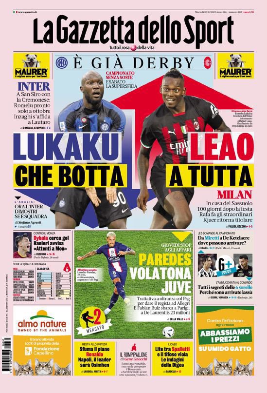 “Sfuma il piano Ronaldo. Resta allo United. Napoli, il leader sarà Osimhen”. Titola in basso in prima pagina la Gazzetta dello Sport nell'edizione odierna. Al centro spazio a Inter e Milan: "”Lukaku, che botta”, “Leao a tutta”. In taglio basso la Juventus che spinge per Paredes e Fabian Ruiz che sbarca a Parigi. Il Napoli incasserà 23 milioni.
