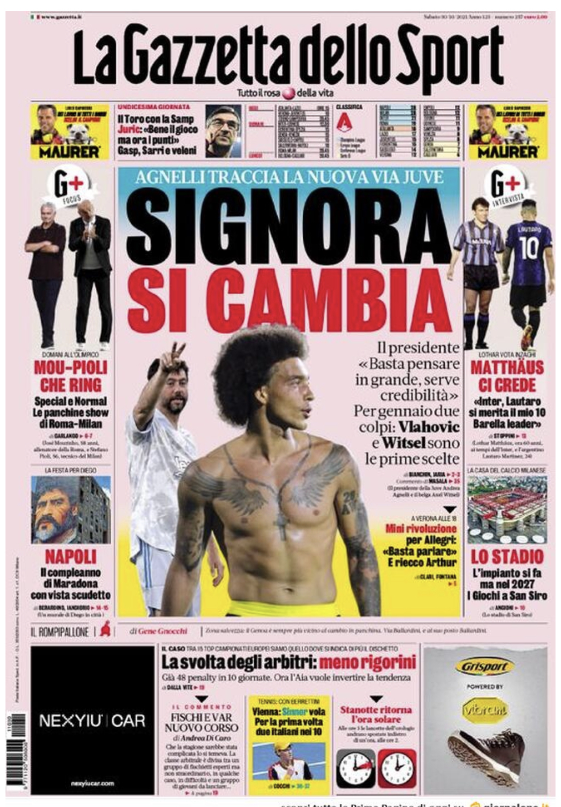 "Signora si cambia" è il titolo con cui si apre l'odierna edizione de La Gazzetta dello Sport questa mattina in edicola in merito alle parole del presidente Agnelli nel corso dell'Assemblea degli Azionisti. "Basta pensare in grande, serve credibilità" ha detto Agnelli cercando di tracciare la nuova via della Juve. Per gennaio due colpi: Vlahovic e Witsel sono le prime scelte. In taglio basso il "compleanno di Maradona con vista Scudetto"
