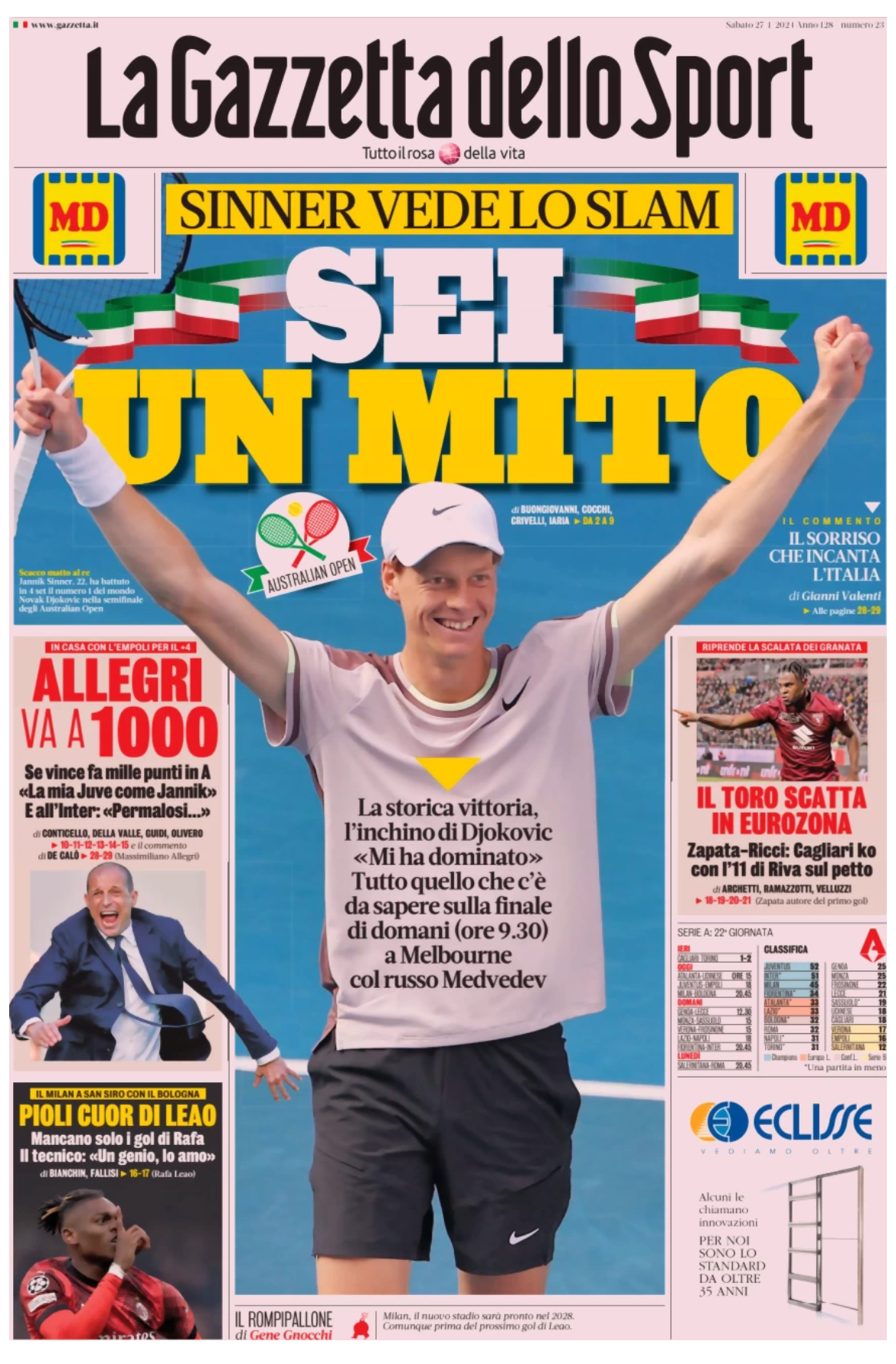 PRIMA PAGINA - Gazzetta: "Sinner, sei un mito. Allegri va a 1000"