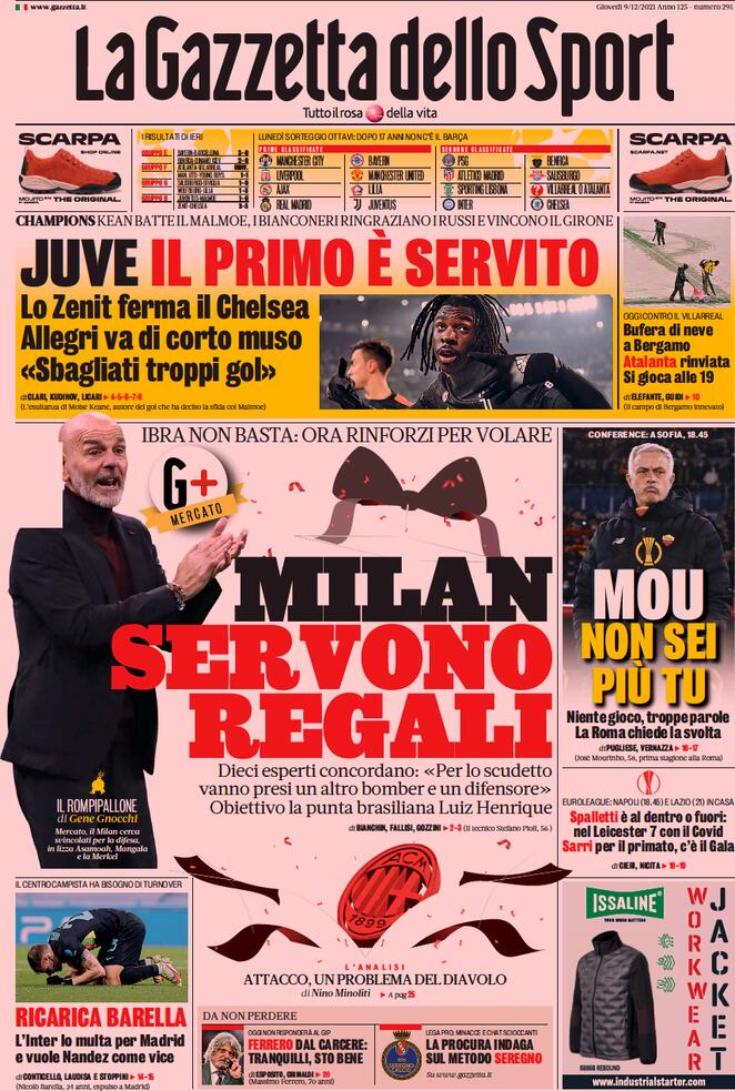 “Milan, servono regali” titola in prima pagina La Gazzetta dello Sport. Ibra non basta - si legge - ora rinforzi per volare. Dieci esperti concordano: “Per lo scudetto vanno presi un altro bomber e un difensore”. Obiettivo, la punta brasiliana Luiz Henrique. Sul Napoli: "Spalletti è al dentro o fuori, Leicester 7 con il Covid".