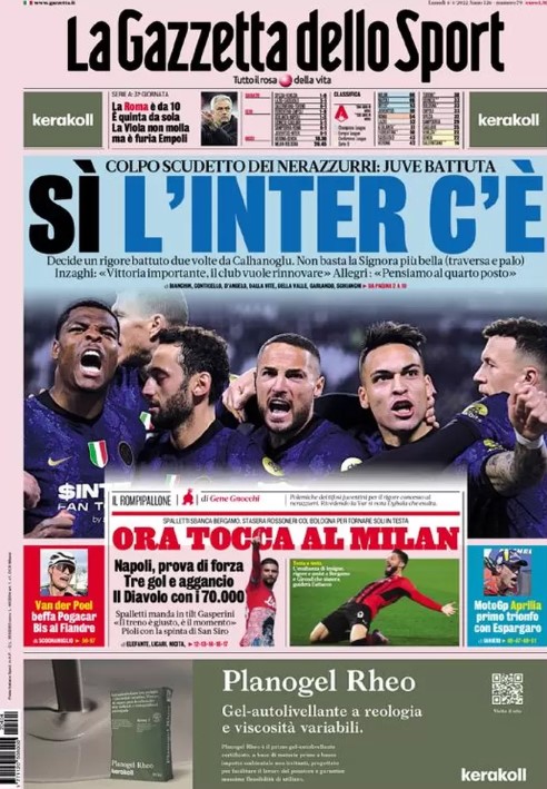 "Sì, l'Inter c'è". Questo il titolo di apertura in prima pagina de La Gazzetta dello Sport nell'edizione odierna. Colpo scudetto dei nerazzurri: Juventus battuta. Decide un rigore battuto due volte da Calhanoglu. Non basta la Signora più bella (traversa e palo). Inzaghi: "Vittoria importante, il club vuole rinnovare". Allegri: "Pensiamo al quarto posto".