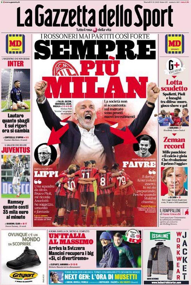 “Sempre più Milan” titola in prima pagina l’edizione odierna de La Gazzetta dello Sport. I rossoneri mai partiti così forte - si legge - La società non si accontenta: così sul mercato sono pronti nuovi investimenti ."Spalletti, Pioli, Inzaghi: lotta scudetto" si legge di spalla con focus su Milan, Napoli e Inter.
