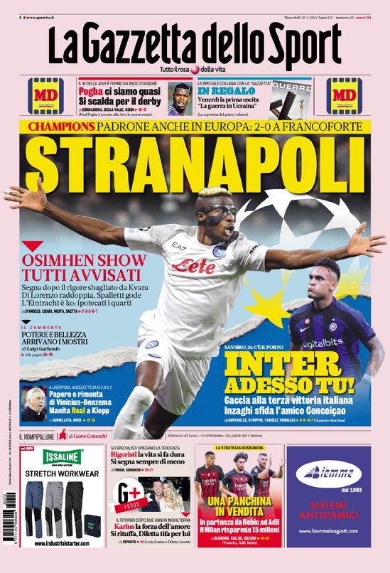 Nell'edizione odierna, la Gazzetta dello Sport apre in prima pagina con la vittoria del Napoli nell'andata degli ottavi di finale di Champions League: "StraNapoli. Padrone anche in Europa: 2-0 a Francoforte. Osimhen show, tutti avvisati". A centro pagina spazio all'Inter, in campo stasera contro il Porto: "Inter, adesso tu!". In taglio alto Pogba, che potrebbe essere prossimo al rientro: "Pogba, ci siamo quasi. Si scalda per il derby".