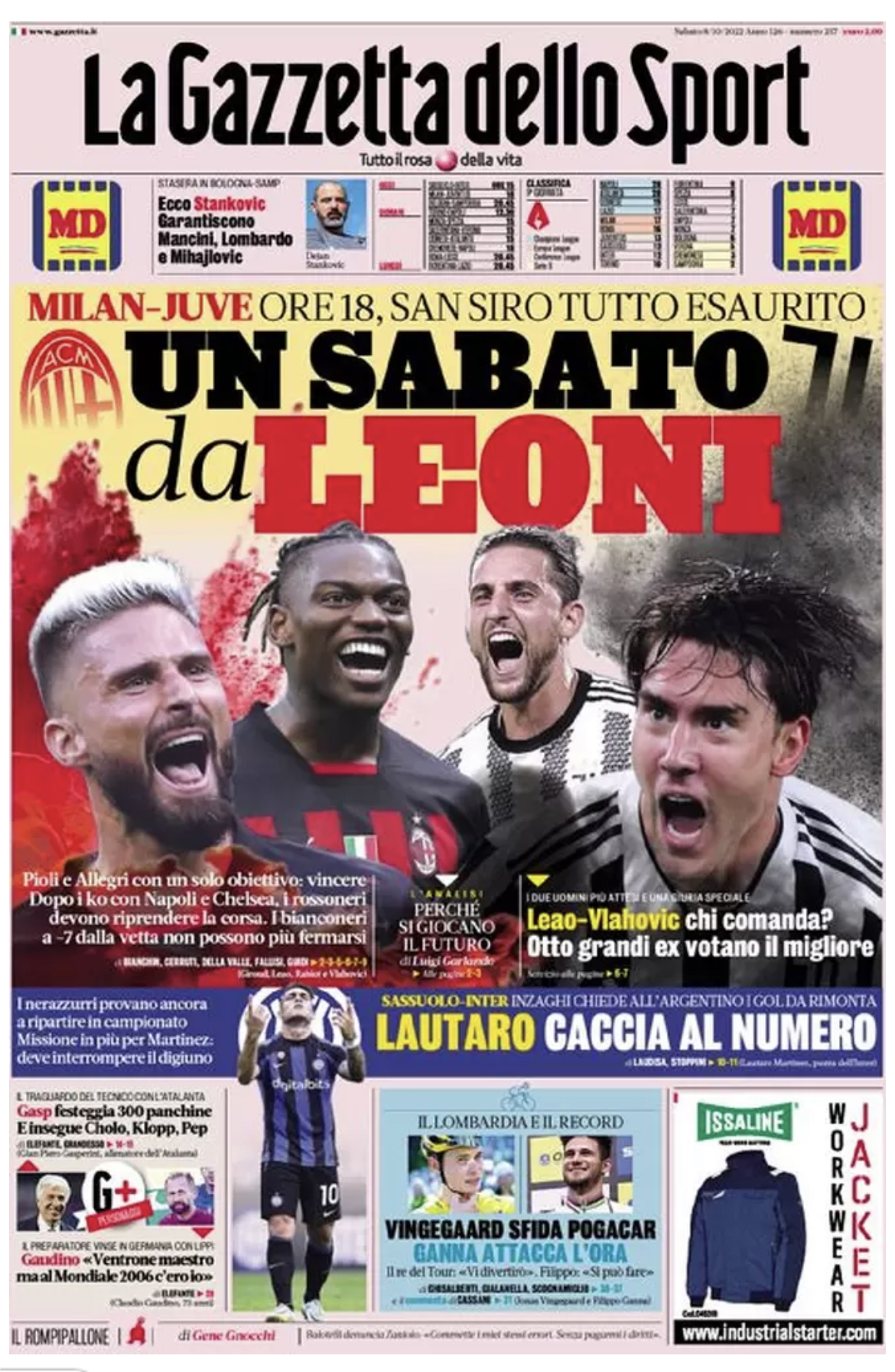 "Un sabato da leoni" è il titolo con cui si apre l'odierna edizione de La Gazzetta dello Sport su Milan-Juventus. San Siro tutto esaurito per il big match di oggi: Pioli e Allegri hanno un unico obiettivo ed è vincere. Dopo i ko con Napoli e Chelsea, i rossoneri devono riprendere la corsa. I bianconeri a -7 dalla vetta non possono più fermarsi.