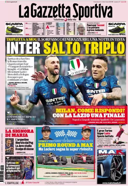 L'Inter rifila un netto 3-1 alla Roma e vola, almeno per una notte, in vetta alla classifica, sorpassando il Milan impegnato oggi contro la Lazio. E La Gazzetta dello Sport non può che dedicare a questo tema l'apertura: "Inter salto triplo".