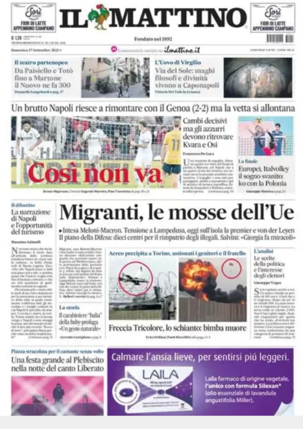 "Brutto Napoli, così non va" si legge sulla prima pagina dell'edizione odierna de Il Mattino. Il commento è relativo alla gara di Marassi col Napoli che pareggia 2-2 contro il Genoa.