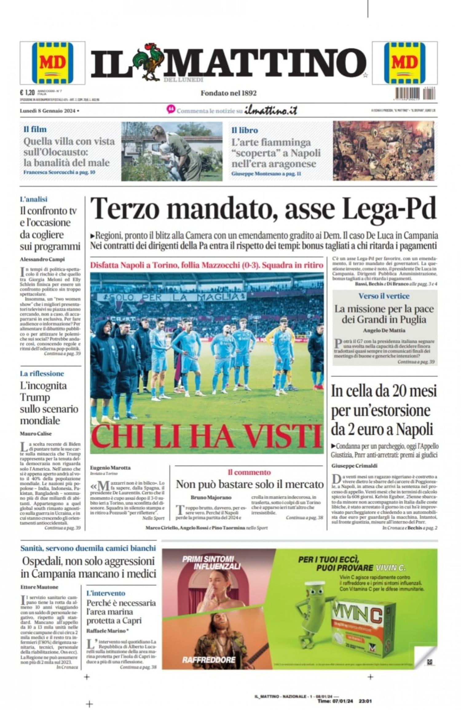 Nell'edizione di oggi, Il Mattino dedica ampio spazio in prima pagina alla debacle del Napoli contro il Torino: "Chi li ha visti. Disfatta Napoli a Torino, follia Mazzocchi (0-3). Squadra in ritiro".