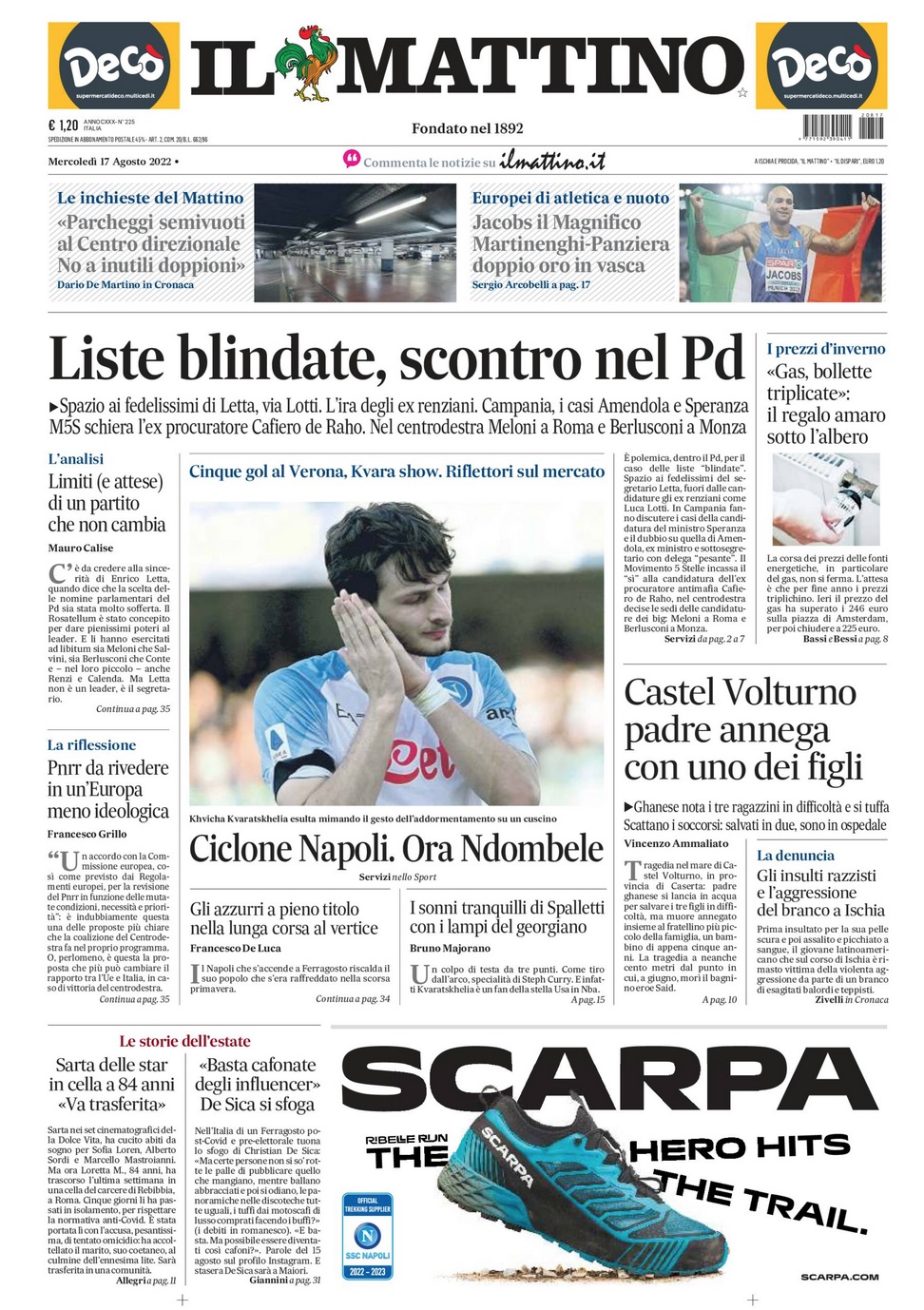 Mercato azzurro in prima pagina sull’edizione odierna de Il Mattino. Il quotidiano napoletano scrive: "Ciclone Napoli. Ora Ndombele". Sull'esordio in campionato contro l'Hellas: "Cinque gol a Verona, Kvara show".