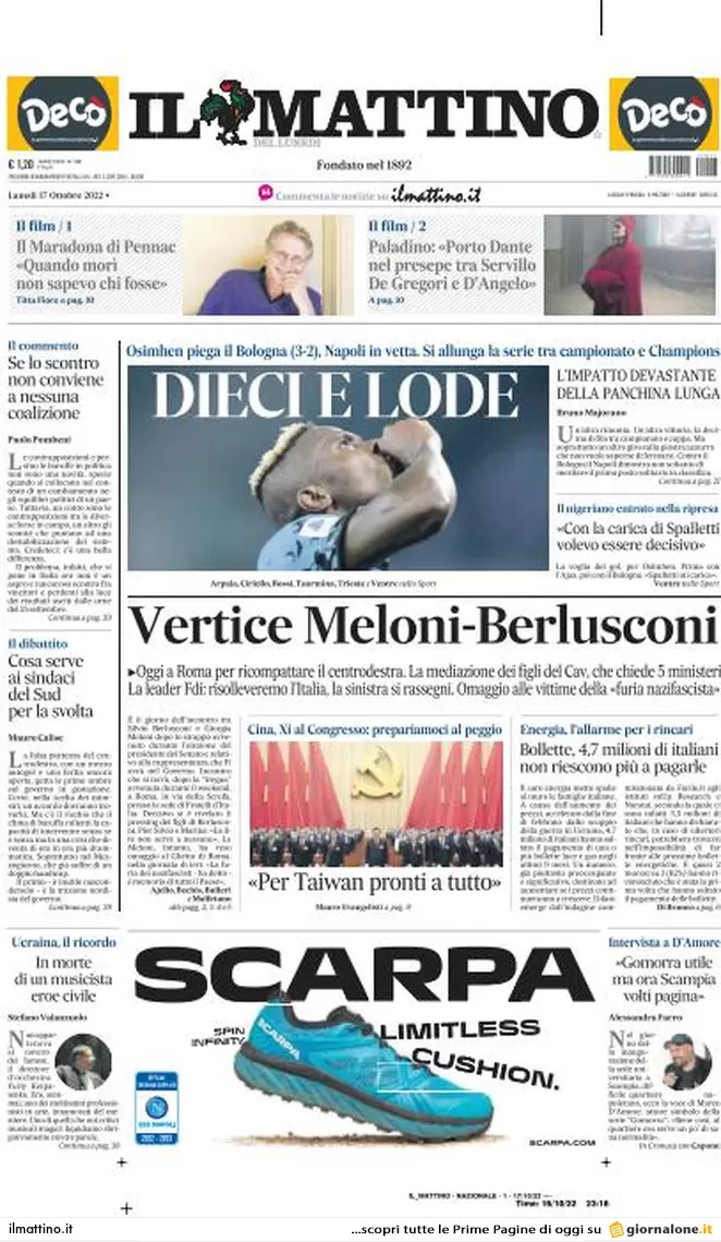 Decima vittoria consecutiva in stagione per il Napoli che vola di nuovo in testa alla classifica di Serie A. Il quotidiano napoletano Il Mattino scrive in prima pagina: "Dieci e lode. Osimhen piega il Bologna (3-2), Napoli in vetta. Si allunga la serie tra campionato e Champions".