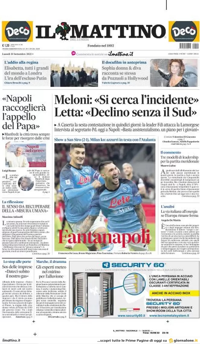 La vittoria del Napoli a San Siro contro il Milan in prima pagina sull’edizione odierna de Il Mattino. Il quotidiano napoletano scrive: "Fantanapoli. Show a San Siro (2-1), Milan ko: azzurri in testa con l'Atalanta".