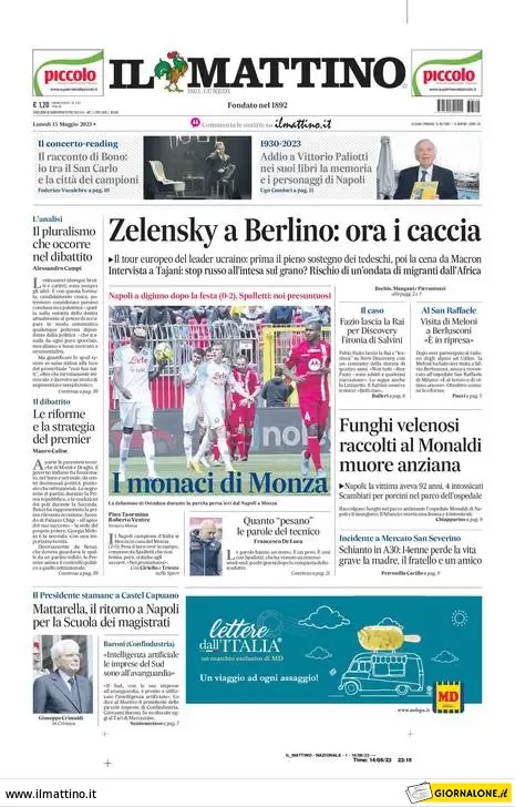 Nell'edizione di oggi, Il Mattino dà spazio alla sconfitta del Napoli in prima pagina: "I monaci di Monza". Il quotidiano napoletano scrive: "Napoli a digiuno dopo la festa (0-2), Spalletti: noi presuntuosi".