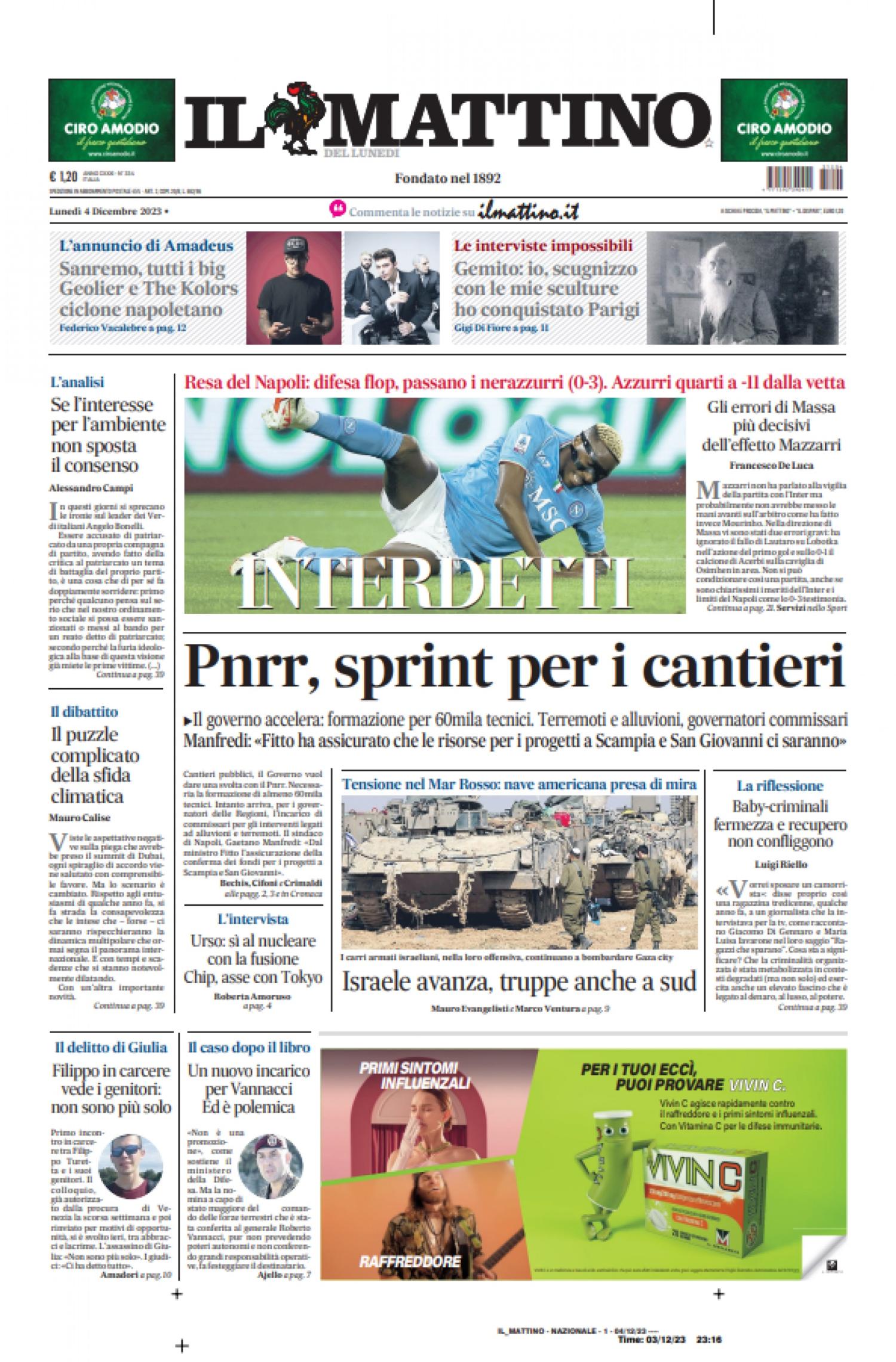 Il Mattino, nell'edizione di oggi, dedica la parte centrale della prima pagina alla sconfitta del Napoli contro l'Inter, gara condizionata dagli errori arbitrali di Massa: "Interdetti. Resa del Napoli, difesa flop: passano i nerazzurri (0-3). Azzurri quarti a -11 dalla vetta".