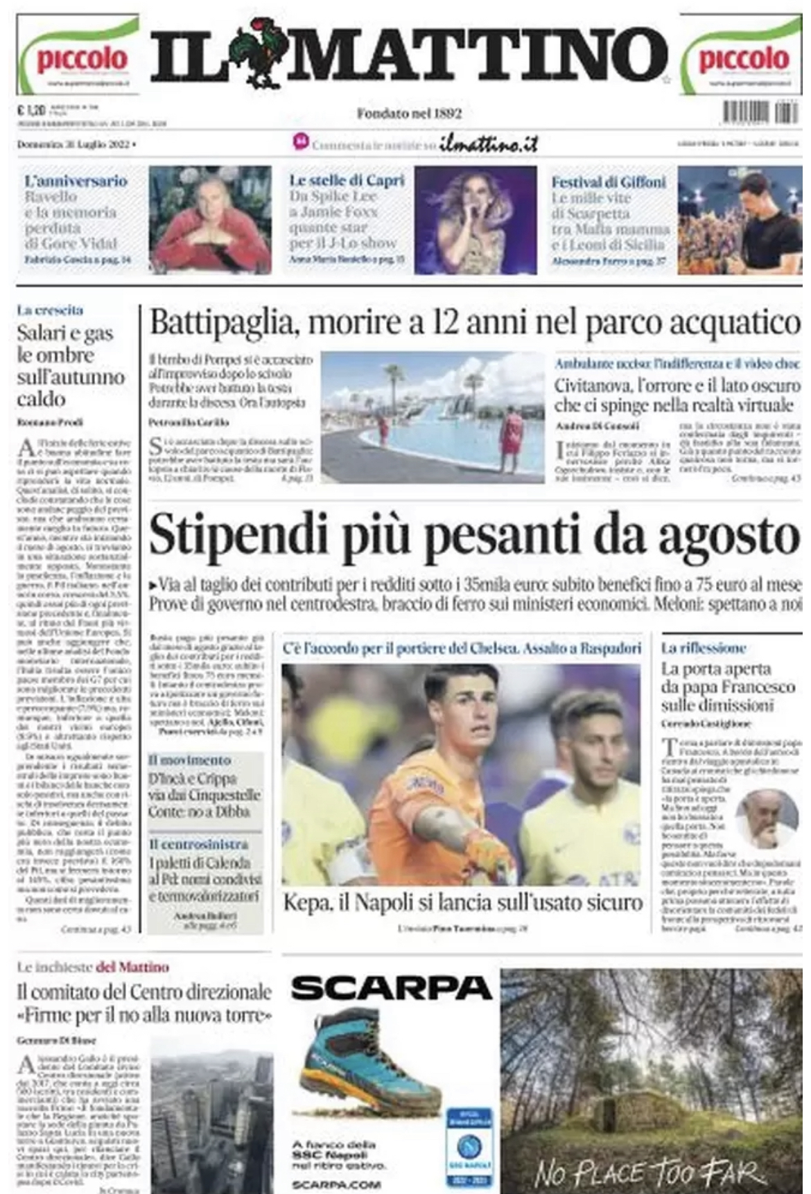 Mercato azzurro in prima pagina sull’edizione odierna de Il Mattino. Il quotidiano napoletano scrive: “Kepa, il Napoli si lancia sull’usato sicuro. C’è l’accordo con il portiere del Chelsea. Assalto a Raspadori”.
