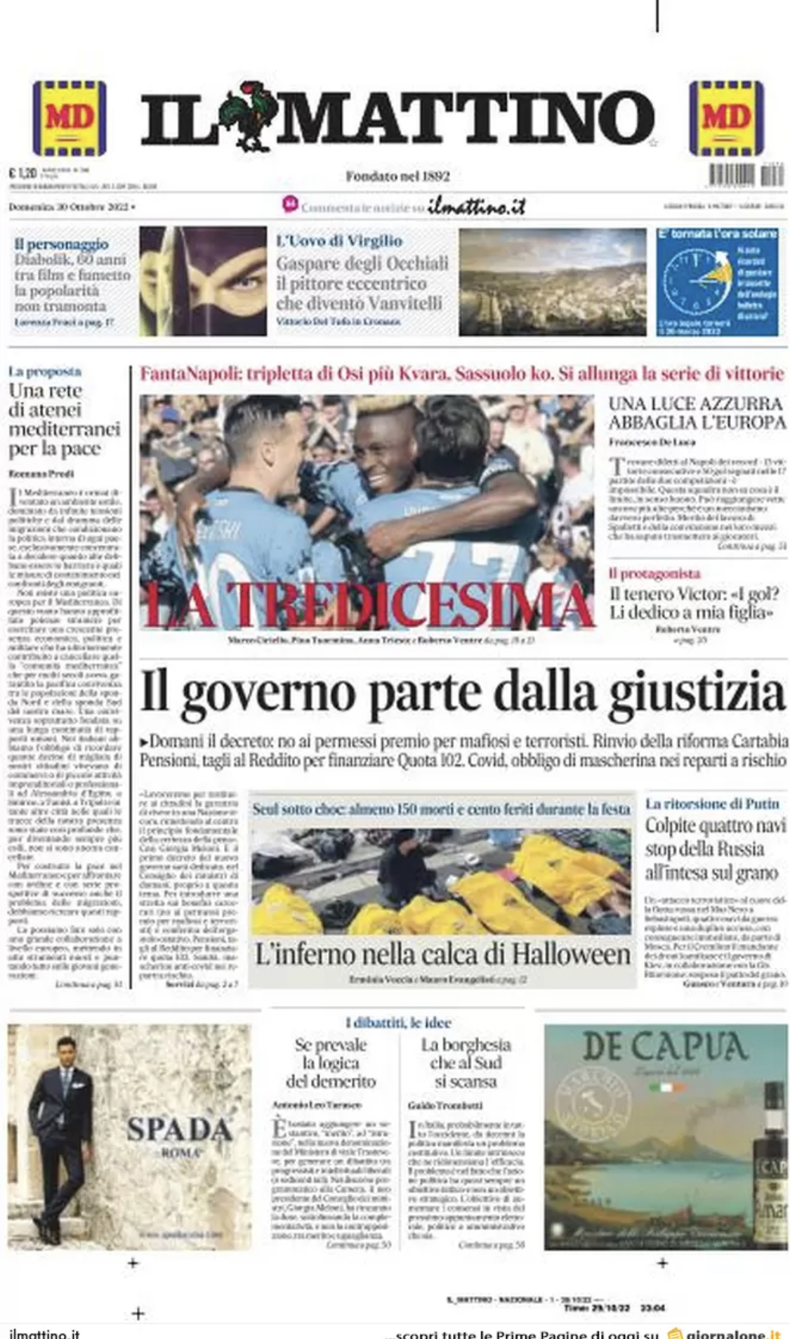 Tredicesima vittoria consecutiva in stagione per il Napoli che allunga in testa alla classifica di Serie A dopo la vittoria contro il Sassuolo. Il quotidiano napoletano Il Mattino scrive in prima pagina: "La tredicesima. Fanta Napoli: tripletta di Osi piú Kvara. Sassuolo ko. Si allunga la serie di vittorie".