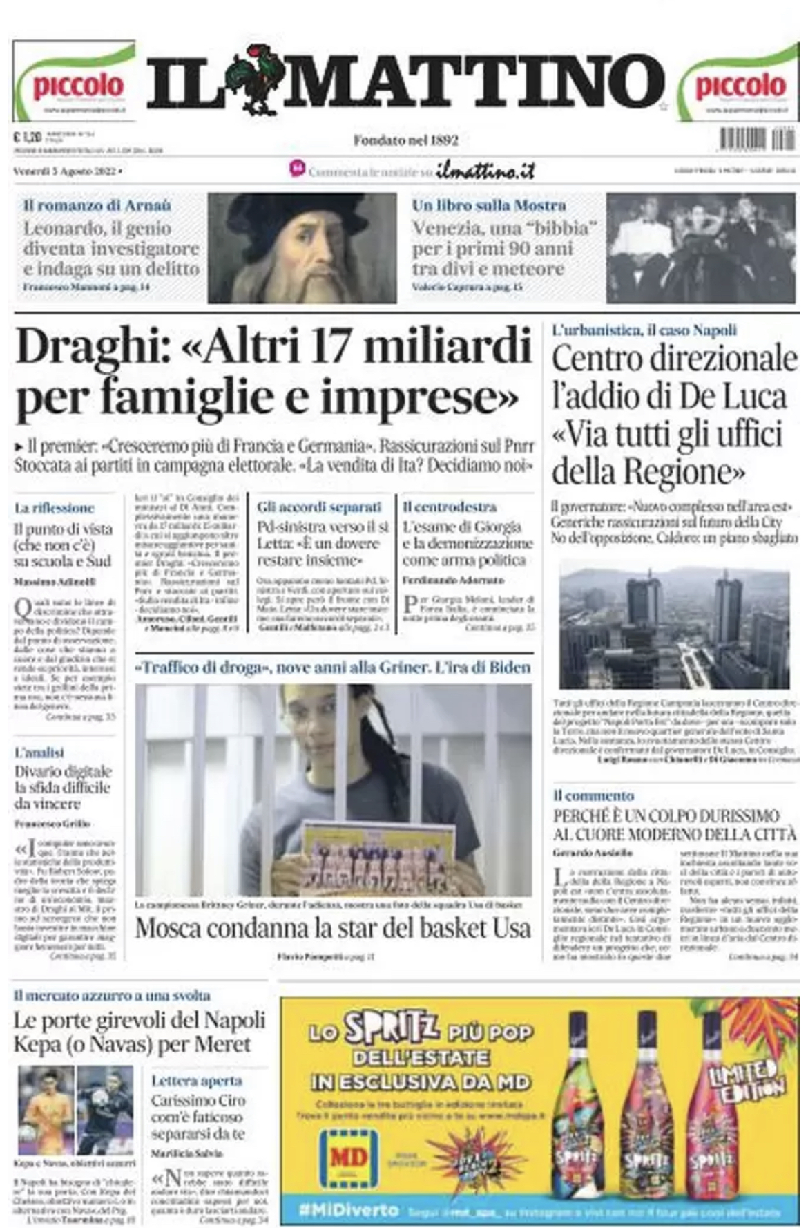 Mercato azzurro in prima pagina sull’edizione odierna de Il Mattino. Il quotidiano napoletano scrive: “Il mercato azzurro a una svolta. Le porte girevoli del Napoli: Kepa (o Navas) per Meret”.
