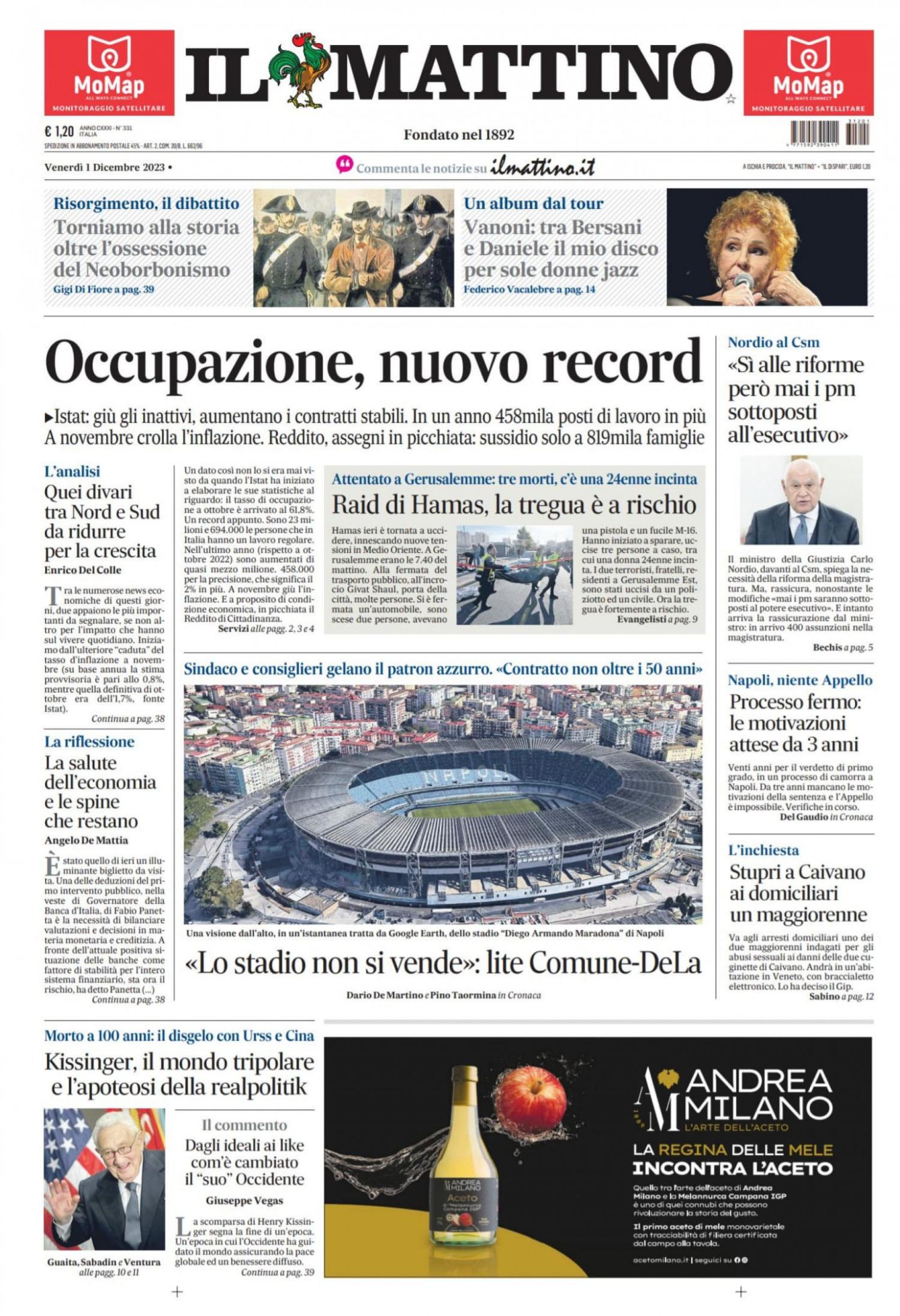 "'Lo stadio non si vende': lite Comune-De La sul Maradona di Napoli" scrive Il Mattino in prima pagina quest'oggi. Sindaco e consiglieri gelano il patron azzurro che nelle scorse ore aveva detto: "Se lo juventino Gaetano (il sindaco Manfredi, ndr) uscirà fuori dal legame col consiglio comunale e riuscirà a vendermi lo stadio Maradona, prometto che in un anno lo renderò il più bello d’Italia". La replica: "Mai nessuna proposta ufficiale. Contratto non oltre i 50 anni".