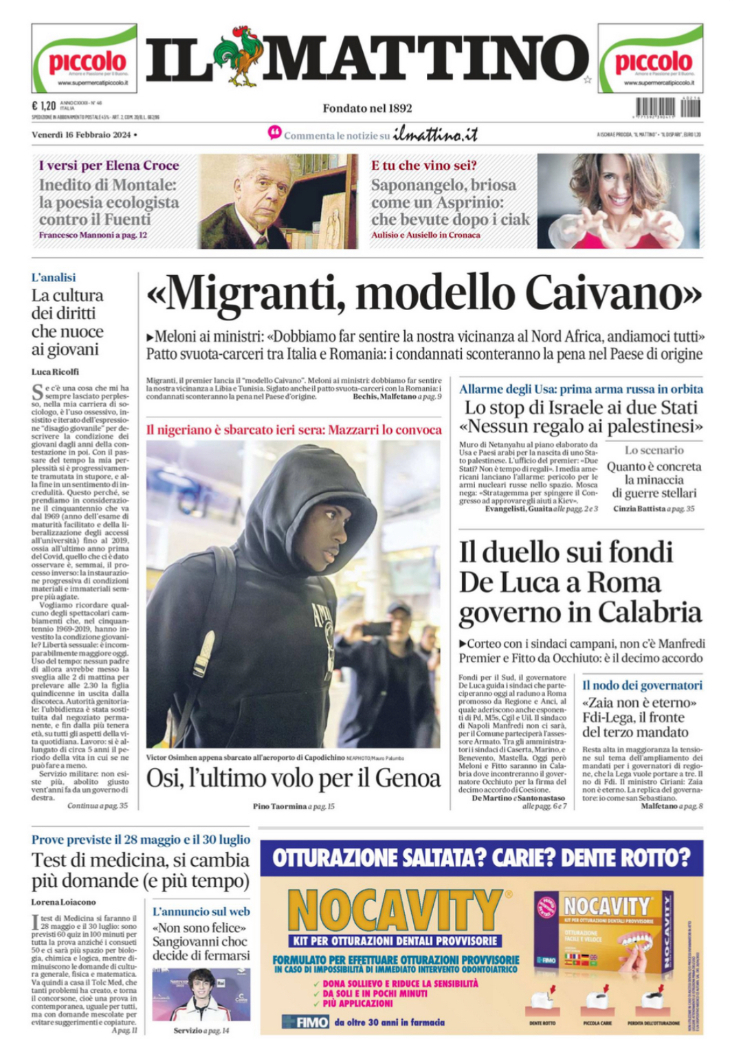 Nell'edizione di oggi, Il Mattino dedica spazio in prima pagina al rientro a Napoli di Victor Osimhen: “Osi, l’ultimo volo per il Genoa. Il nigeriano è sbarcato ieri sera: Mazzarri lo convoca”.