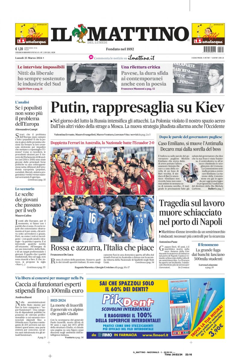 Nell'edizione di oggi, Il Mattino dedica spazio in prima pagina alla doppietta della Ferrari e alla vittoria della Nazionale nella tournée negli Stati Uniti: "Rossa e azzurra, l'Italia che piace. Doppietta Ferrari in Australia, la Nazionale batte l'Ecuador 2-0".