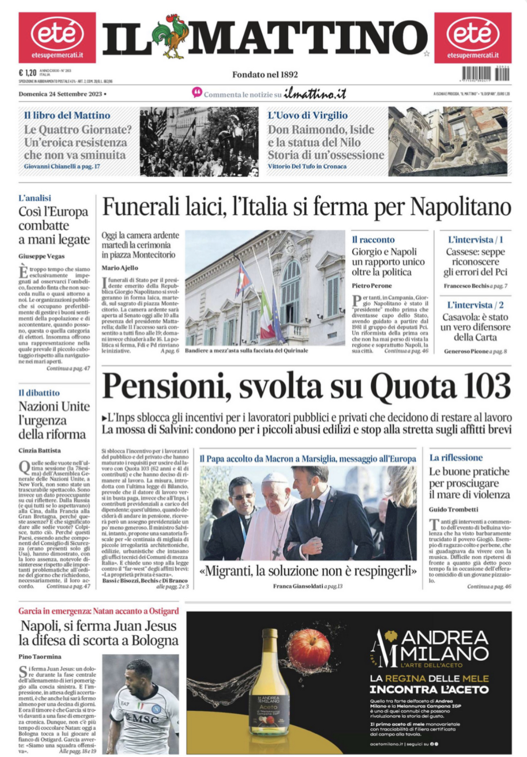 PRIMA PAGINA - Il Mattino: “Si ferma Juan Jesus: la difesa di scorta a Bologna”