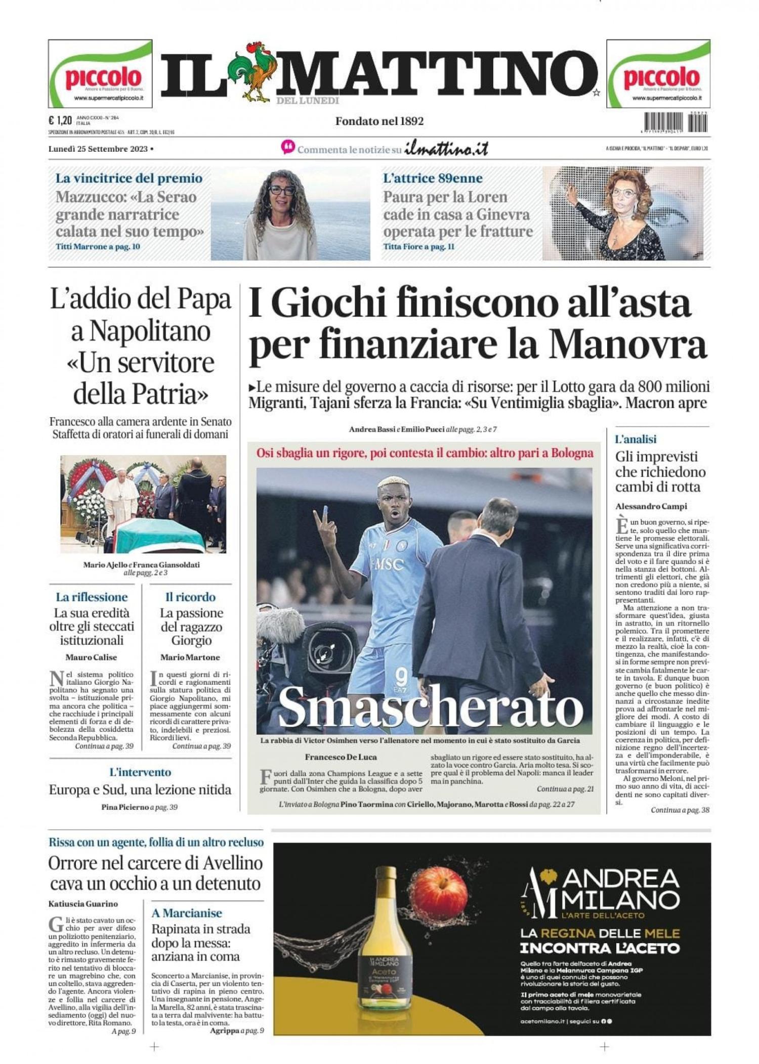 Nell'edizione di oggi, Il Mattino apre in prima pagina con il pareggio del Napoli a Bologna e la protesta di Osimhen contro Garcia dopo il cambio: "Smascherato. Osi sbaglia un rigore, poi contesta il cambio: altro pari a Bologna".