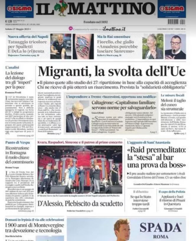 Il Mattino dedica ampio spazio al Napoli in prima pagina. "Tatuaggio tricolore per Spalletti. E DeLa lo (ri)tenta", si legge in merito al nuovo tatoo di Spalletti e le tante voci sul futuro dell'allenatore di Certaldo. In primo piano spazio anche al concerto di Gigi D'Alessio con tanti calciatore, da Kvaratskhelia a Raspadori, sul palco: "D'Alessio, Plebiscito da scudetto"
